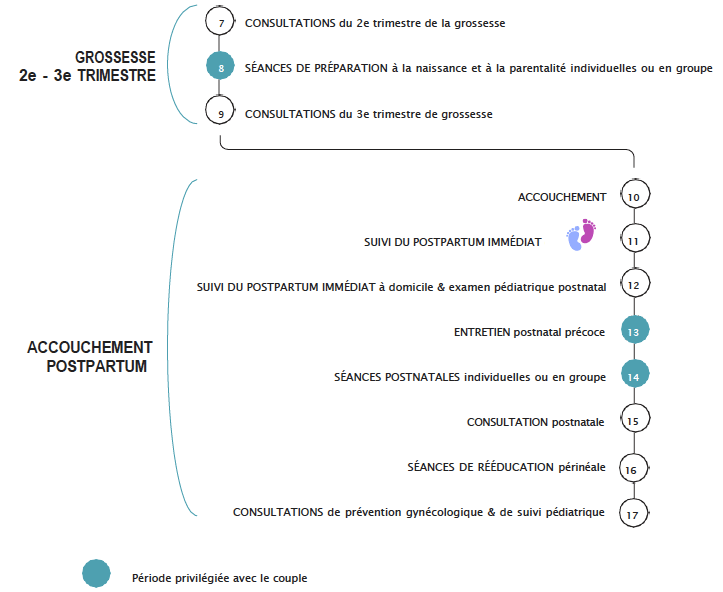 Un entretien post natal peut être réalisé entre la 4ème et la 8ème semaine après l’accouchement. Un second entretien sera envisagé selon les besoins entre la 10ème et la 14ème semaine post natale. Ces entretiens ont pour but de déceler les dépressions post-natales afin d’informer et donner des ressources au couple.